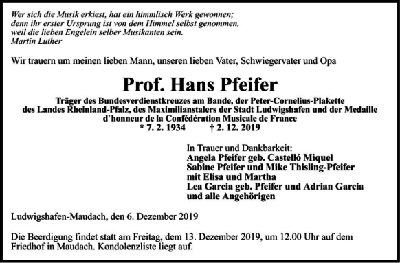 Mannheimer Musikhochschule. Hans Pfeifer (Bild) ist im Alter von 85 Jahren gestorben. Der Maudacher hatte 1969 das Jugendblasorchester des Heuss-Gymnasiums gegründet, aus dem das städtische