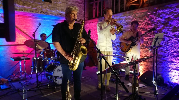 Oliver Strauch, Bassist Matthias Debus und Gitarrist Marcus Amani begleitet, liefen die Bläser (Olaf Schönborn, Altsaxofon, Matthias Dörsam, Tenorsaxofon, Sebastian Nagler, Baritonsaxofon) zu
