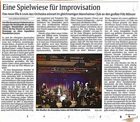 Und der dritte Grund, warum es ein besonderer Tag war: Das Ella & Louis Jazz Orchestra ehrte das Urgestein der Mannheimer Jazz-Szene eben auf dem Spinelli-Gelände, wo sich ehemals die Barracks der US-Armee befanden - und wo Fritz Münzer musikalisch groß geworden ist. Dort gab es damals Offiziersclubs, in denen auch auch die deutsche Szene Musik gemacht hat.